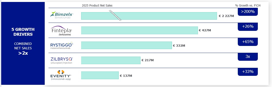 Strong growth driven by BIMZELX®, FINTEPLA®, RYSTIGGO®, ZILBRYSQ®, EVENITY®, BRIVIACT®, with BIMZELX® access expansion & net pricing dynamics, Briviact LOE and a perimeter effect from sale of non-core assets in 2025