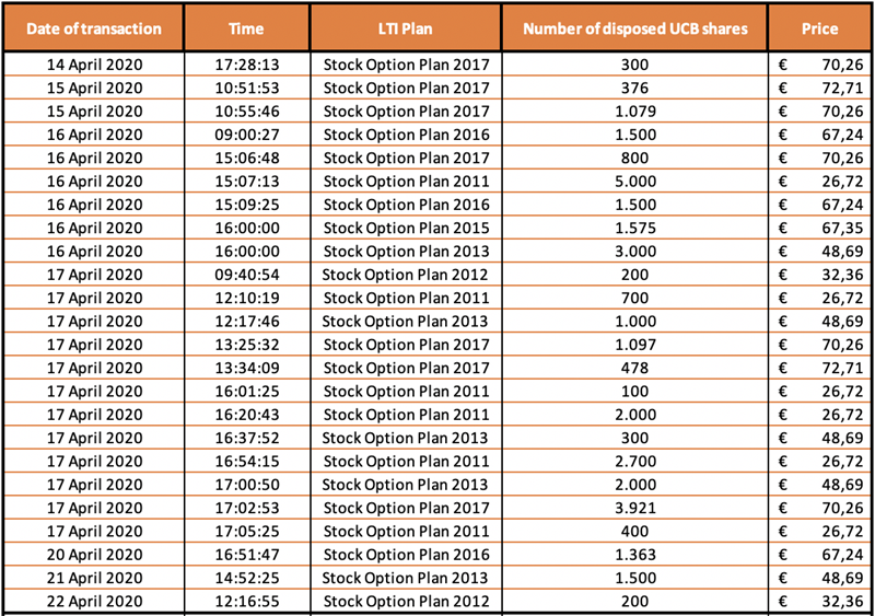 1216 Likes Acquisitions of own shares and Disposals of own shares Brussels (Belgium), 23 April 2020 – 20:00 (CEST) – regulated information Acquisitions of own shares In accordance with article 8:4 of the Royal Decree of 29 April 2019 executing the Belgian Code on Companies and Associations, UCB SA/NV (“UCB” or the “Company) (Euronext Brussels: UCB) hereby discloses certain information in relation to its Share Repurchase Program 2020. Under this program, UCB has requested a financial intermediary to repurchase up to 1.2 million UCB shares on its behalf under the terms of an initial discretionary mandate agreement with validity until 15 June 2020, effective as from 25 March 2020, to cover current and future obligations under UCB's Long Term Incentive Plans for its personnel. In the framework of this Share Repurchase Program 2020, UCB repurchased 57 050 UCB shares on Euronext Brussels in the period from 14 April 2020 up to and including 22 April 2020, as follows: Disposals of own shares In accordance with article 8:6 of the Royal Decree executing the Belgian Code of Companies and Associations, UCB announces that, following exercises of stock options by members of its personnel, it has disposed of UCB shares OTC in view of deliveries of these shares to the relevant members of the personnel, within the framework of the Long Term Incentive Program of the UCB Group, as follows: This press release is available on UCB SA/NV’s website via the following link. For further information, UCB: Investor Relations Antje Witte Investor Relations, UCB T +32.2.559.94.14 antje.witte@ucb.com Isabelle Ghellynck Investor Relations, UCB T+32.2.559.9588, isabelle.ghellynck@ucb.com About UCB UCB, Brussels, Belgium (www.ucb.com) is a global biopharmaceutical company focused on the discovery and development of innovative medicines and solutions to transform the lives of people living with severe diseases of the immune system or of the central nervous system. With 7 500 people in approximately 40 countries, the company generated revenue of € 4.9 billion in 2019. UCB is listed on Euronext Brussels (symbol: UCB). Follow us on Twitter: @UCB_news Asset Download 20200423 Verwerving en vervreemding van eigen aandelen - NL 20200423 - Rachat et Alie nation d actions propres - FR 20200423UCB Acquisitions and disposals of own shares - EN 1216 Likes