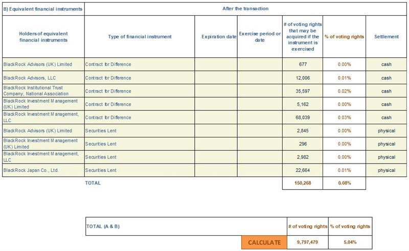 939 Likes Transparency notification BlackRock, Inc. · Notification referring to situation on 31 December 2019 · Threshold crossed: 5% · Latest holding: 5.04% Brussels (Belgium), 7 January 2020 – 20:00 (CET) – regulated information 1. Summary of the notification Pursuant to Article 14 of the law of 2 May 2007 on the disclosure of large shareholdings, UCB SA/NV announces that it has received a transparency notification from BlackRock, Inc. (having its registered office at 55 East 52nd Street, New York, NY, 10055, U.S.A.), dated 2 January 2020. BlackRock, Inc., has notified that, following a disposal of UCB shares with voting rights by its affiliates, its holding of UCB shares with voting rights has decreased and has crossed downwards the 5% threshold on 31 December 2019. On 31 December 2019, BlackRock, Inc. (taking into account the holding of its affiliates) Inc. owned 9 647 211 UCB shares with voting rights (versus 9 735 421 shares in its previous notification), representing 4.96% of the total number of shares issued by the company (194 505 658) (versus 5.01% in its previous notification), as well as 150 268 equivalent financial instruments (versus 198 312 in its previous notification) representing 0.08% of the total number of shares issued by the company (versus 0.10% in its previous notification). 2. Content of the notification Reason for the notification: Acquisition or disposal of voting securities or voting rights. Notification by: A parent undertaking or a controlling person. Persons subject to the notification requirement: Date on which the threshold is crossed: 31 December 2019. Threshold crossed (in %): 5% Denominator: 194 505 658. Notified details: Chain of controlled undertakings through which the holding is effectively held: Please see the full chain of control in the ‘Chain of Control’ tab. Additional information: The disclosure obligation arose due to voting rights attached to shares for BlackRock, Inc. going below 5%. 3. Further information This press release and the detailed transparency notification are available on UCB SA/NV’s website via the following link. An updated overview of the UCB SA/NV large shareholdings will be available on UCB SA/NV’s website via the following link. Investor Relations Antje Witte Investor Relations, UCB T +32.2.559.94.14 antje.witte@ucb.com Isabelle Ghellynck, Investor Relations, UCB T+32.2.559.9588, isabelle.ghellynck@ucb.com About UCB UCB, Brussels, Belgium (www.ucb.com) is a global biopharmaceutical company focused on the discovery and development of innovative medicines and solutions to transform the lives of people living with severe diseases of the immune system or of the central nervous system. With 7 500 people in approximately 40 countries, the company generated revenue of € 4.6 billion in 2018. UCB is listed on Euronext Brussels (symbol: UCB). Follow us on Twitter: @UCB_news Asset Download ae1b742fd03d20c5.pdf (212.01 KB) 82dd1094dbb9bea8.pdf (223.97 KB) b5d5ac423923d3a6.pdf (283.22 KB) 939 Likes